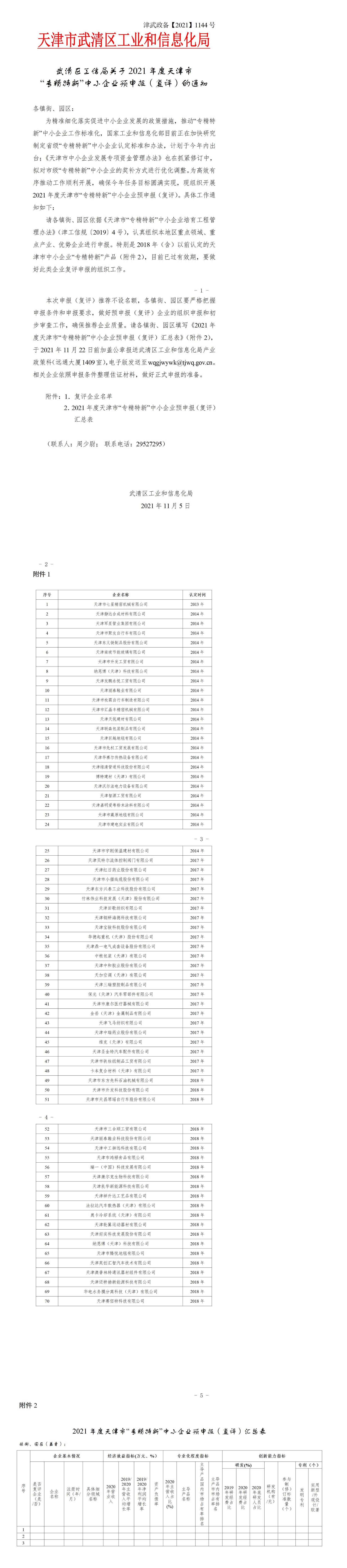 武清区2021年度天津市“专精特新”中小企业预申报(复评)的通知