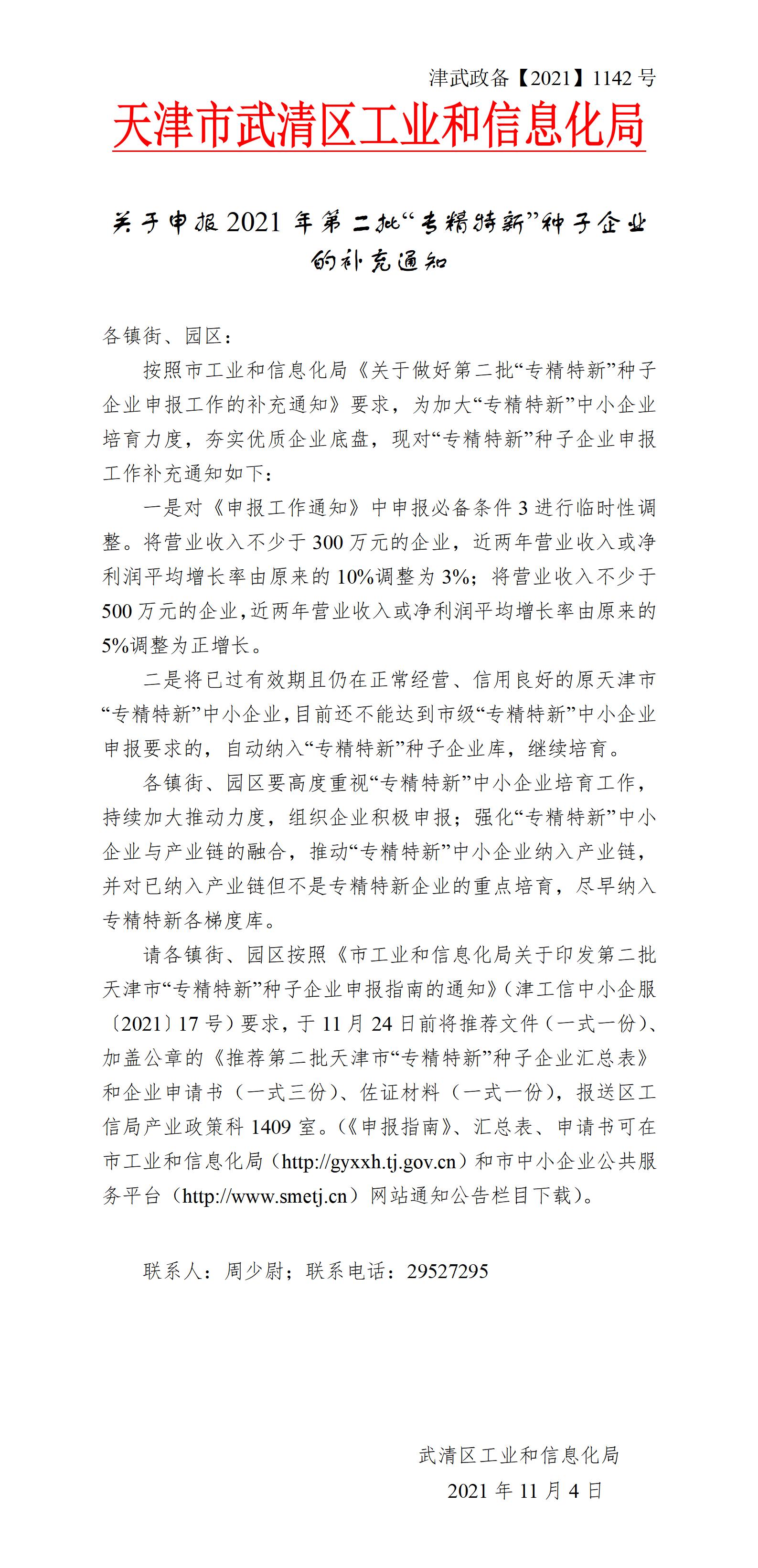 武清区关于申报2021年第二批专精特新种子企业补充通知